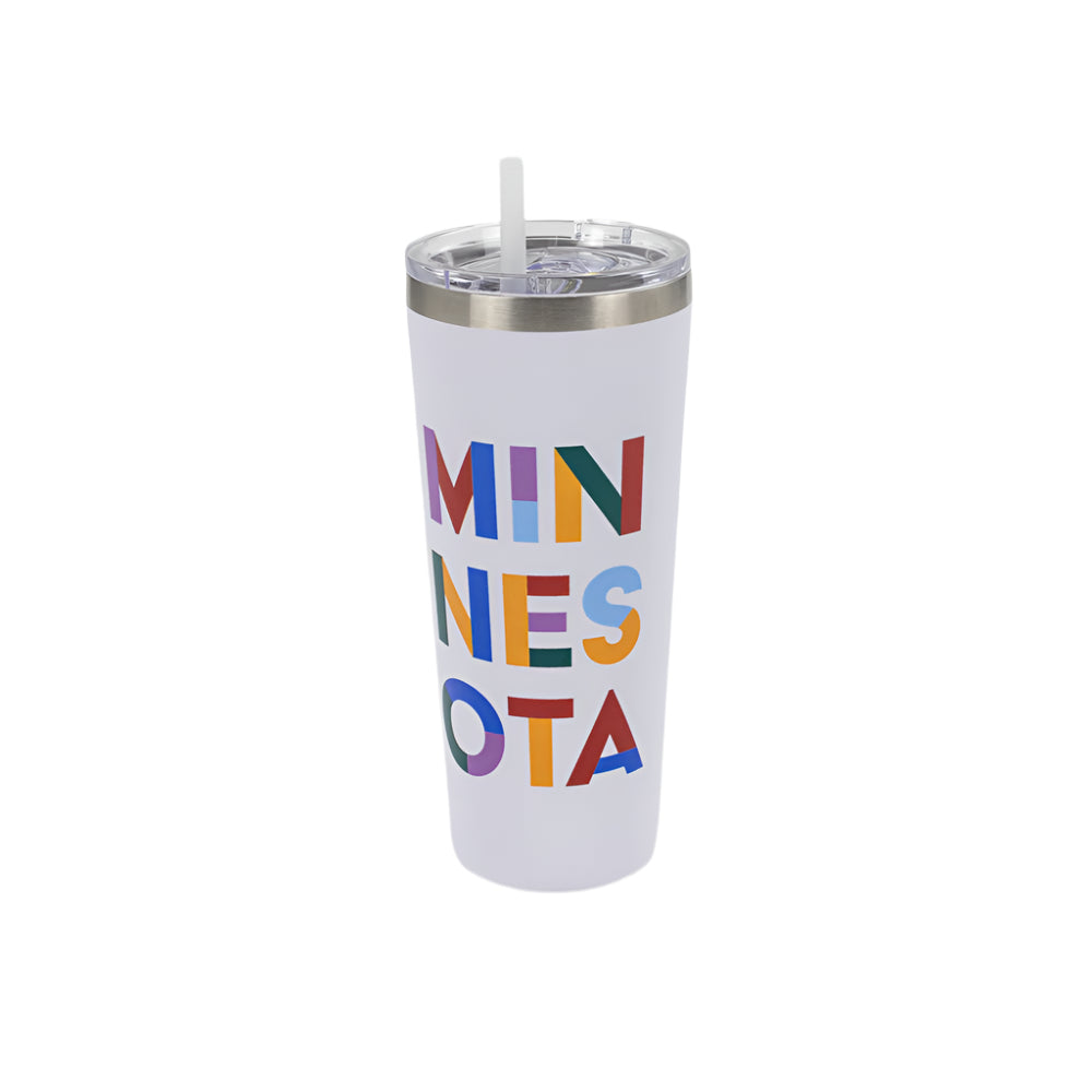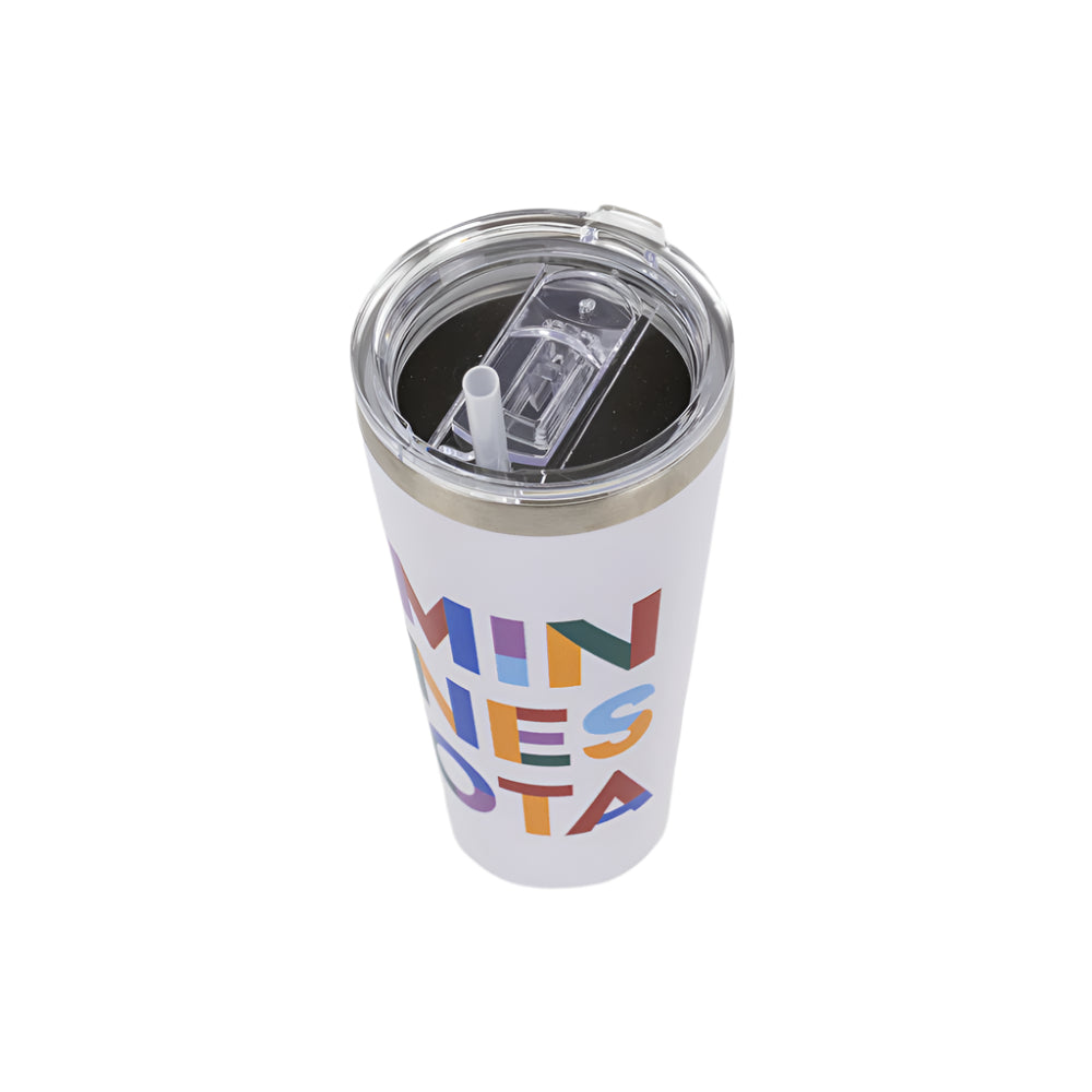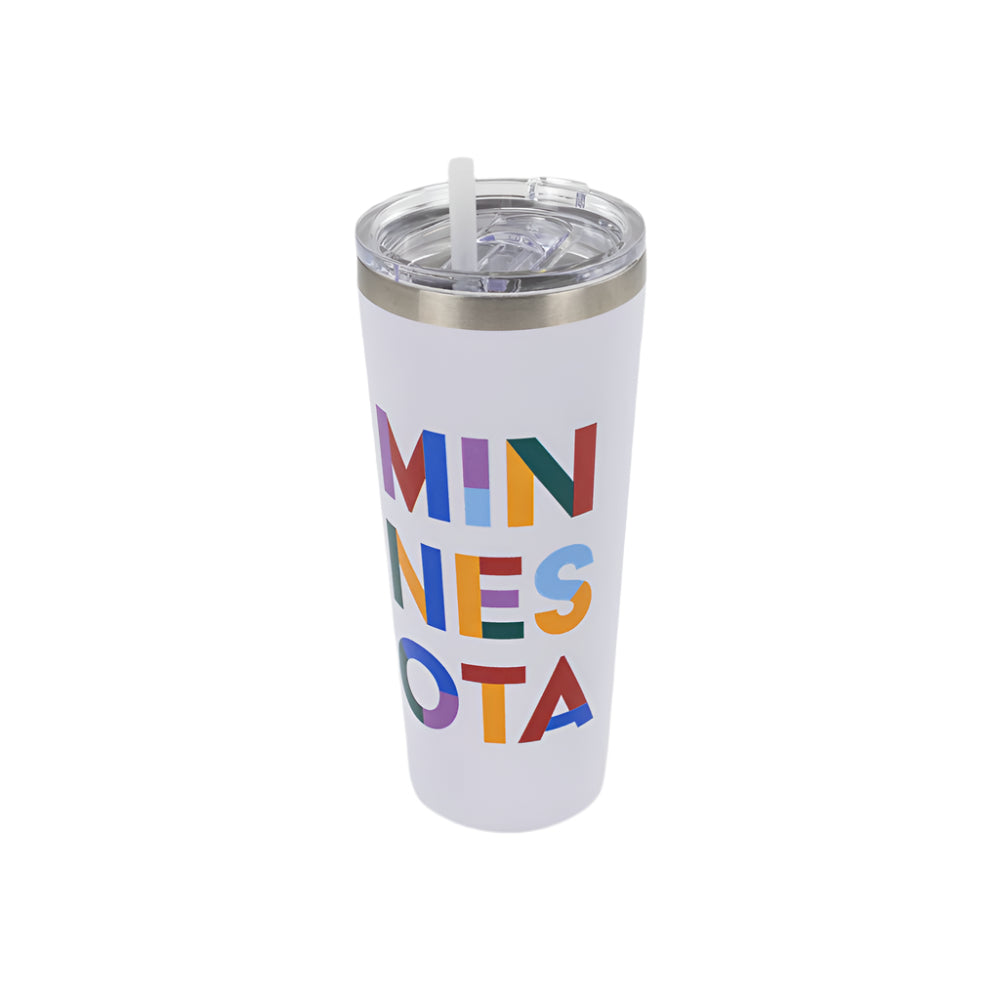 Show off your state pride in style with the Colorful Minnesota Block Text Tumbler. This sleek white tumbler features bold, block lettering that spells out “MINNESOTA” vertically in a rainbow of vibrant colors—making it a cheerful companion for your daily drinks. The silver rim and clear lid add a modern touch, while the insulated design keeps your beverages hot or cold for hours.