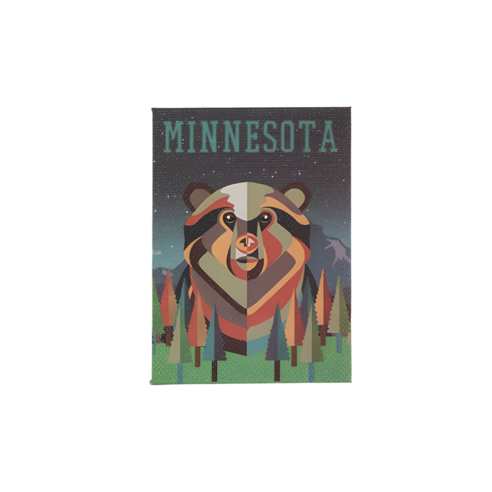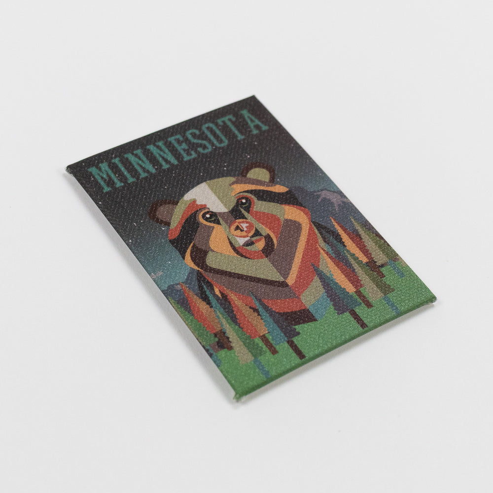 Add a cozy touch to your collection with the Minnesota Bear Cloth Magnet! Measuring 2.5 by 3.5 inches, this magnet features a bear silhouette against pine trees and a dark night sky, with "MINNESOTA" boldly shining above. Crafted on cloth fabric, it offers a unique texture and look that stands out on any magnetic surface. Perfect for Minnesotans and visitors who love a little wild charm with a soft, tactile twist!