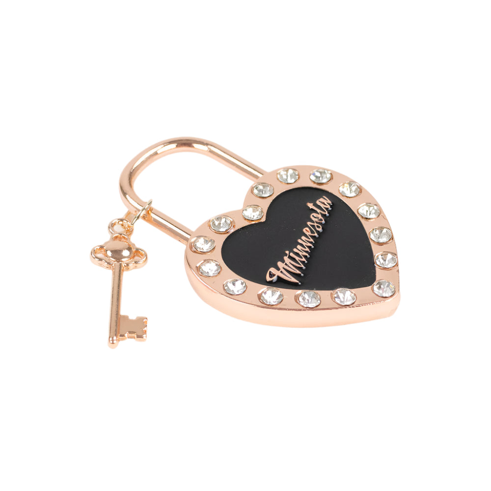 Add a touch of elegance and state pride to your collection with this Minnesota heart magnet. Crafted from painted metal with a sleek black background, it features a radiant rose gold finish and shimmering rhinestones along the edge for just the right amount of sparkle. Perfect for displaying on your fridge, locker, or magnetic board.