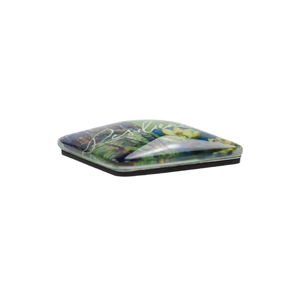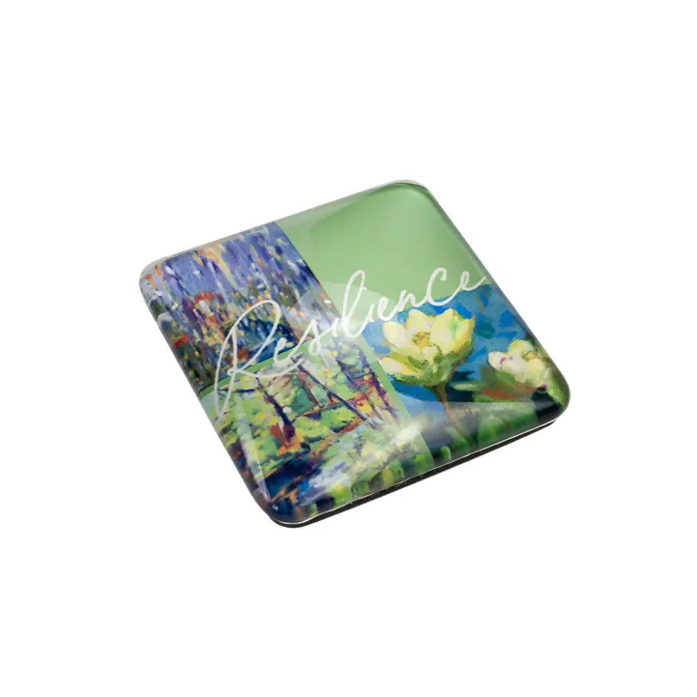Bring a daily dose of strength and beauty to your space with the Art of Resilience Glass Magnet. This 2"x 2" square glass cabochon magnet features a trio of expressive paintings by local artist Lisa Kirkbride. Created in tones of green, blue, and yellow, this magnet transforms any magnetic surface into a reminder that resilience is powerful and peaceful.