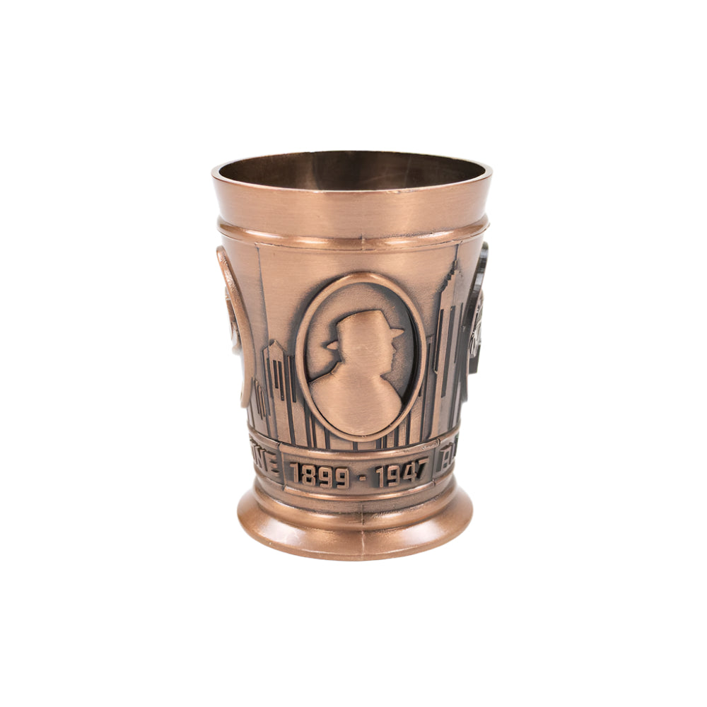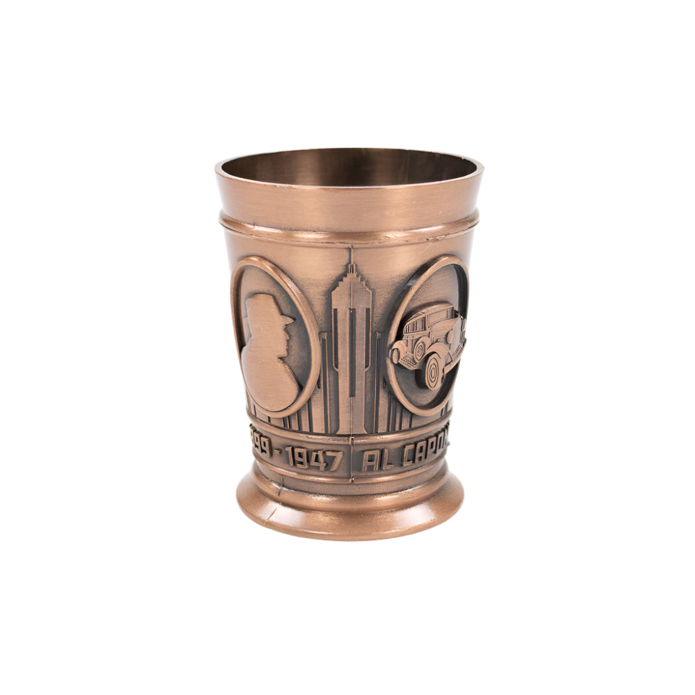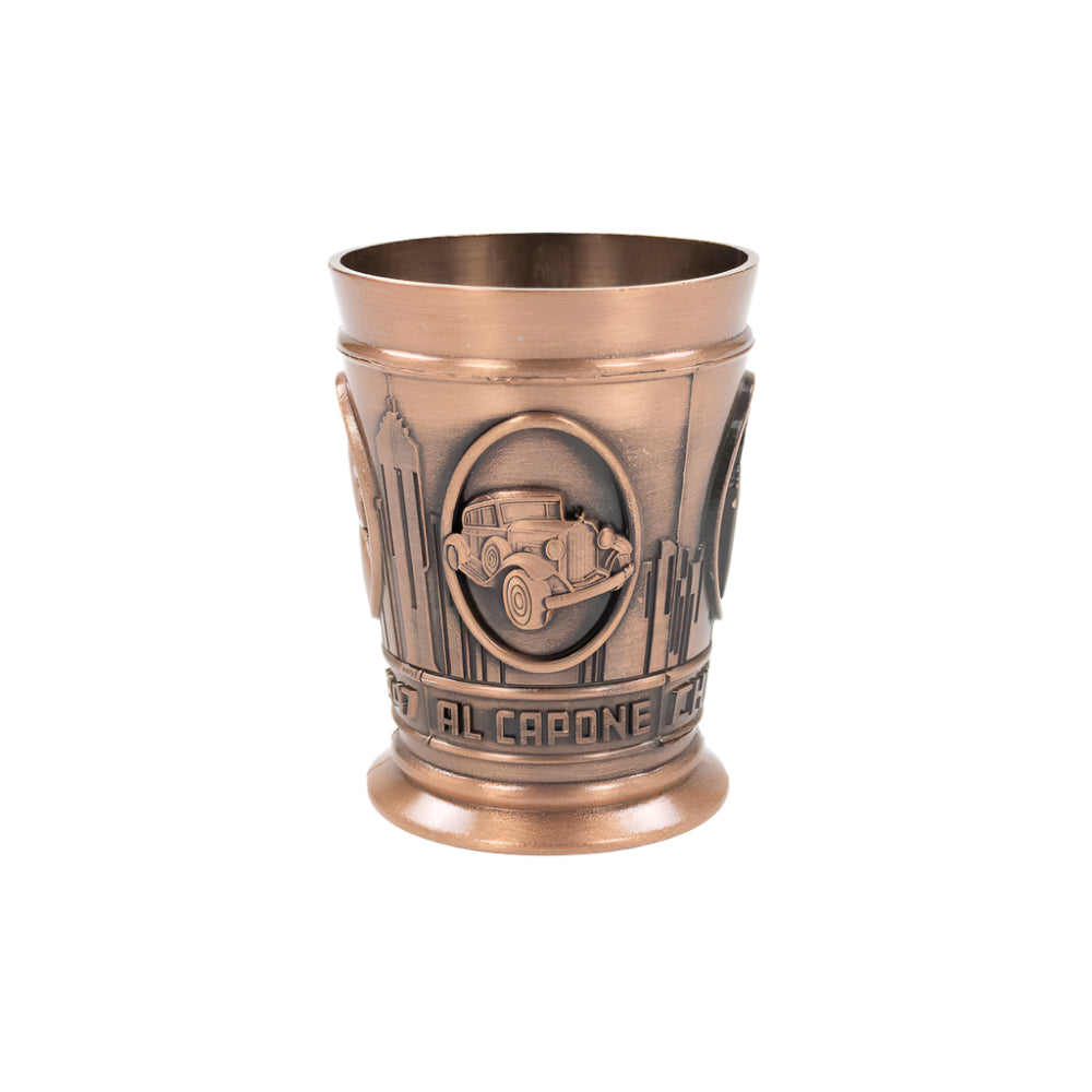 Raise a glass to Chicago’s notorious past with the Al Capone Copper Shot Glass! This decorative collector’s piece features embossed details like Al Capone’s profile, the city skyline, a vintage liquor bottle, a classic hat, and an early 1900s vehicle. Perfect for fans of mobster history or as a quirky souvenir from the crime boss’s stomping grounds, it’s a playful nod to the legend of the Windy City — just don’t try to sneak a sip!