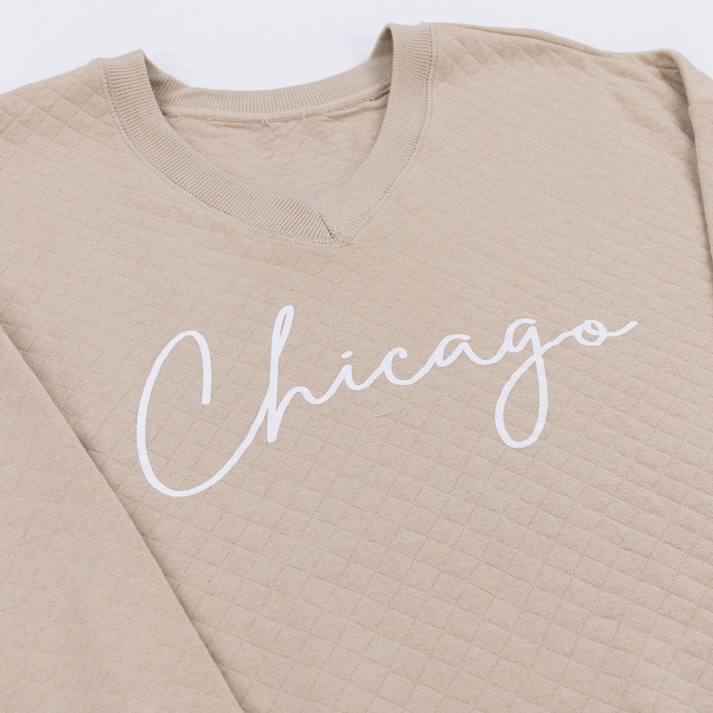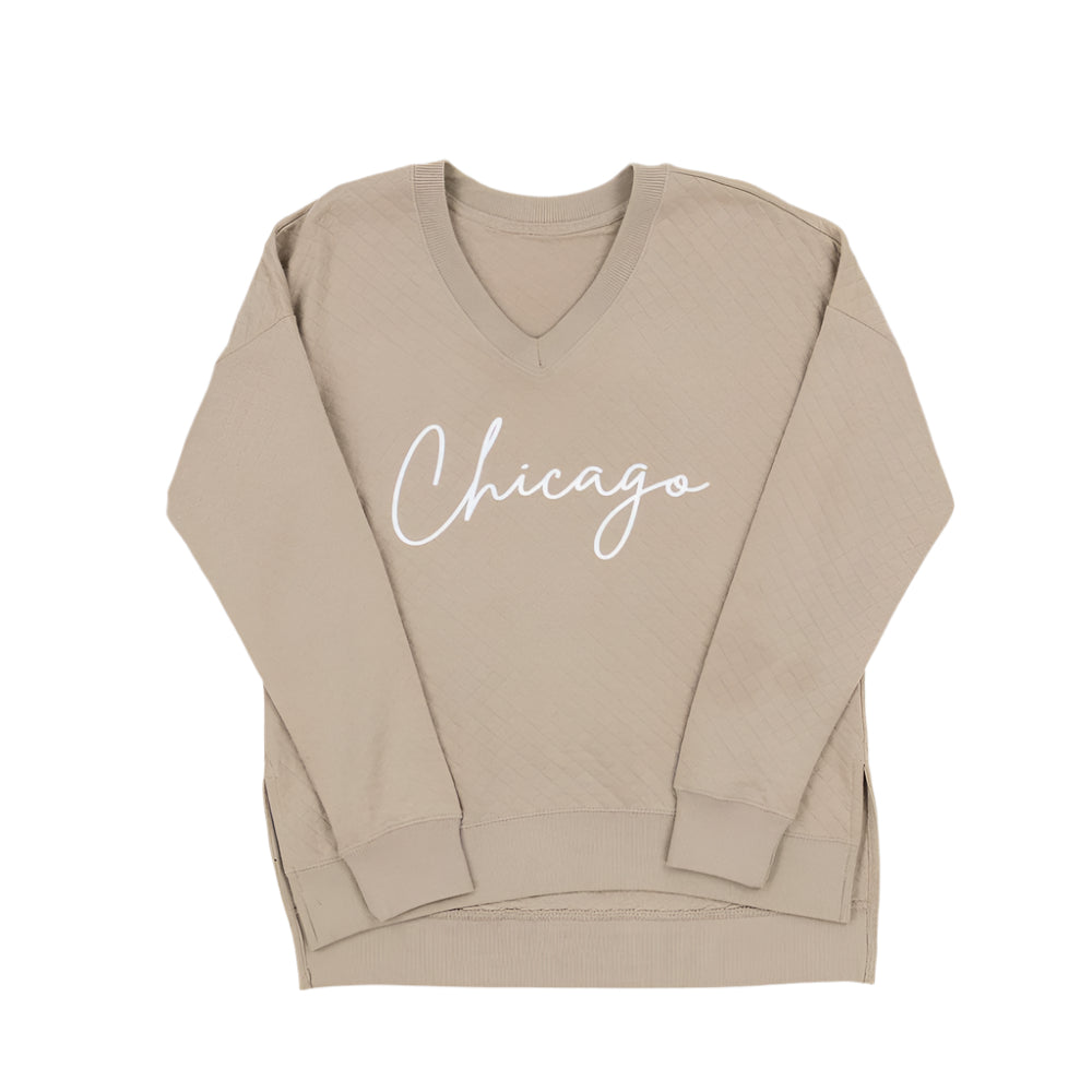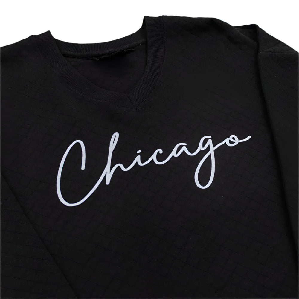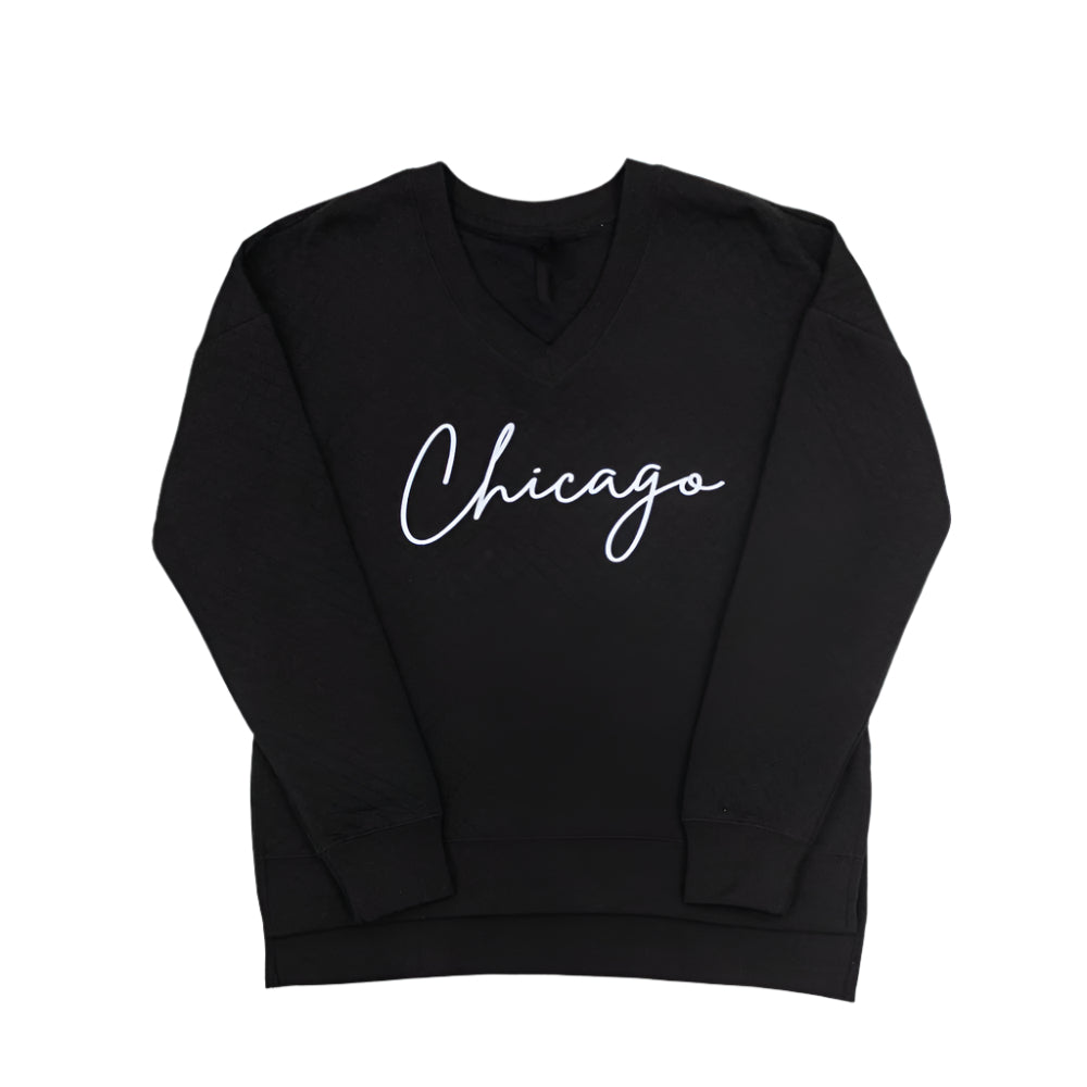 Wrap yourself in up in comfort and style with the Chicago Quilted V-Neck Sweatshirt. Featuring a relaxed fit and a stylish V-neckline, this sweatshirt layers effortlessly over your favorite tees and under jackets for a versatile look. The quilted pattern paired with the Chicago script font adds a level of elegance and class to any comfy outfit.