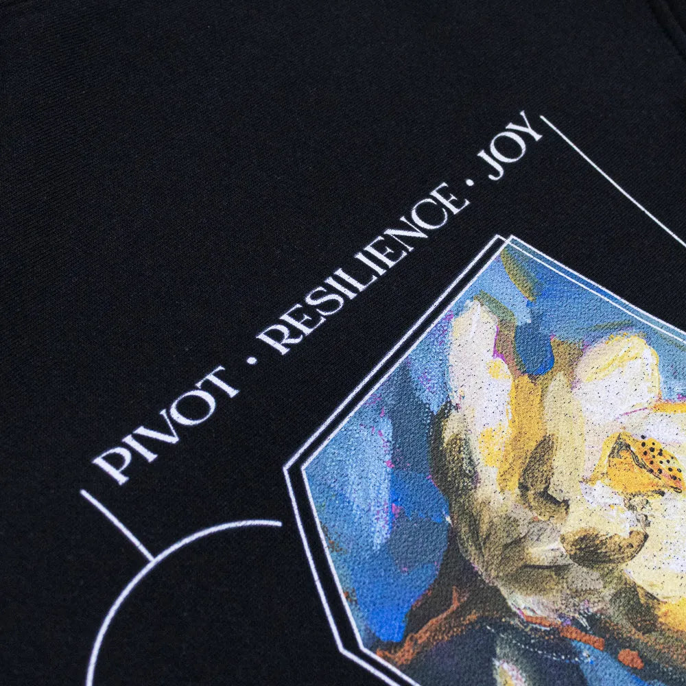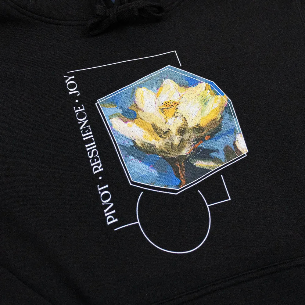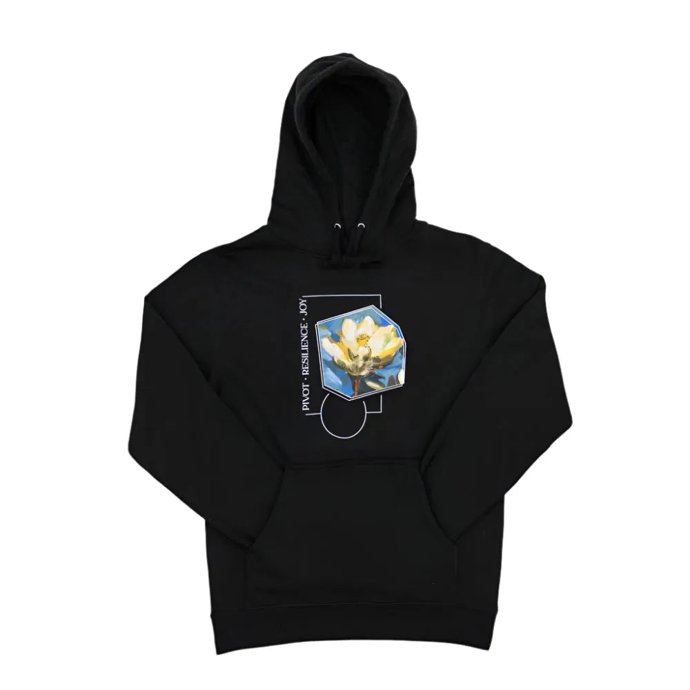 Elevate your wardrobe with this black hooded sweatshirt featuring Lisa Kirkbride’s lotus painting within her signature, exclusive symbol representing joy, pivot, and resilience. Visually captivating and deeply meaningful, this piece is a tribute to strength, transformation, and the power of art.