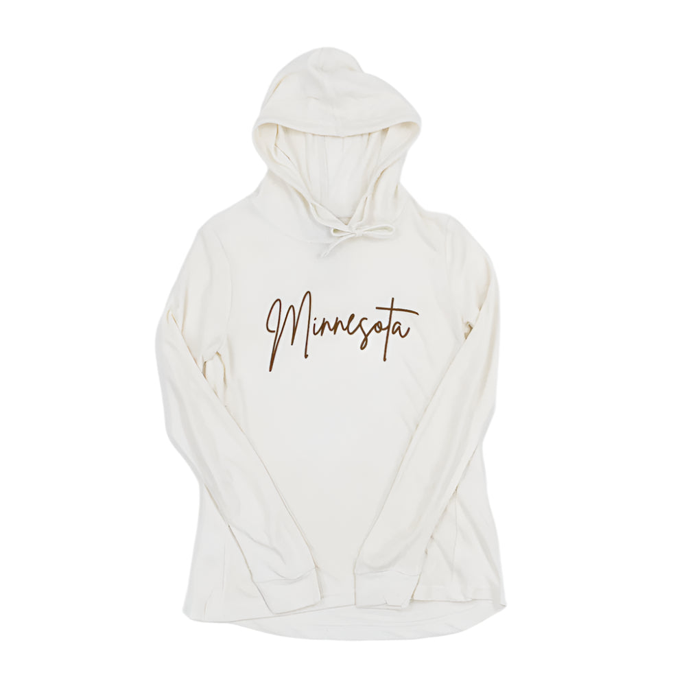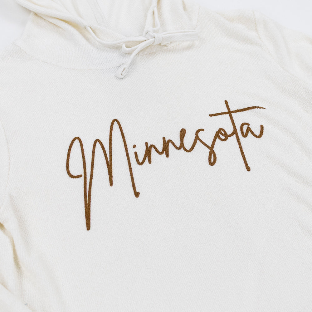 Designed with a modern, feminine touch, the flowing Minnesota script across the chest is understated yet stylish—an easy way to show your state pride without shouting it. Available in soothing Slate Blue and soft Pearl, it’s the kind of piece you’ll reach for again and again, all year long.