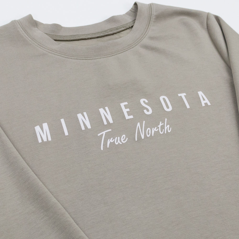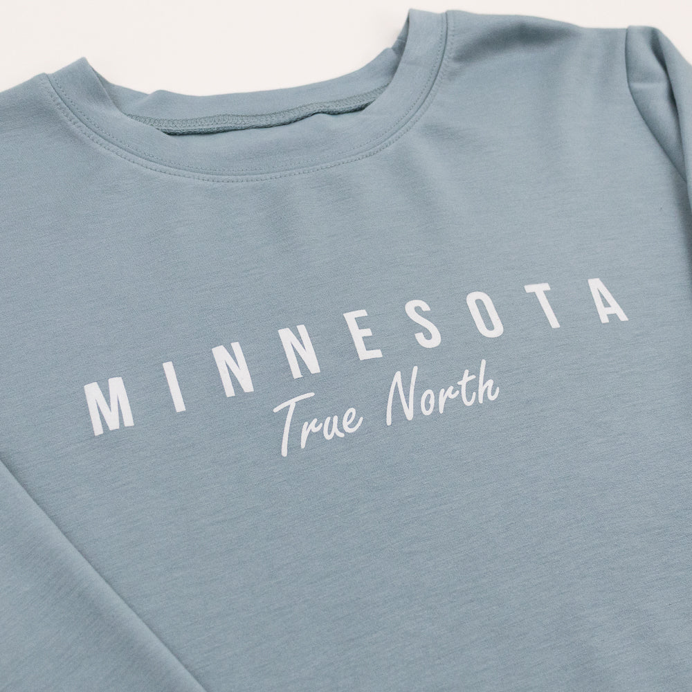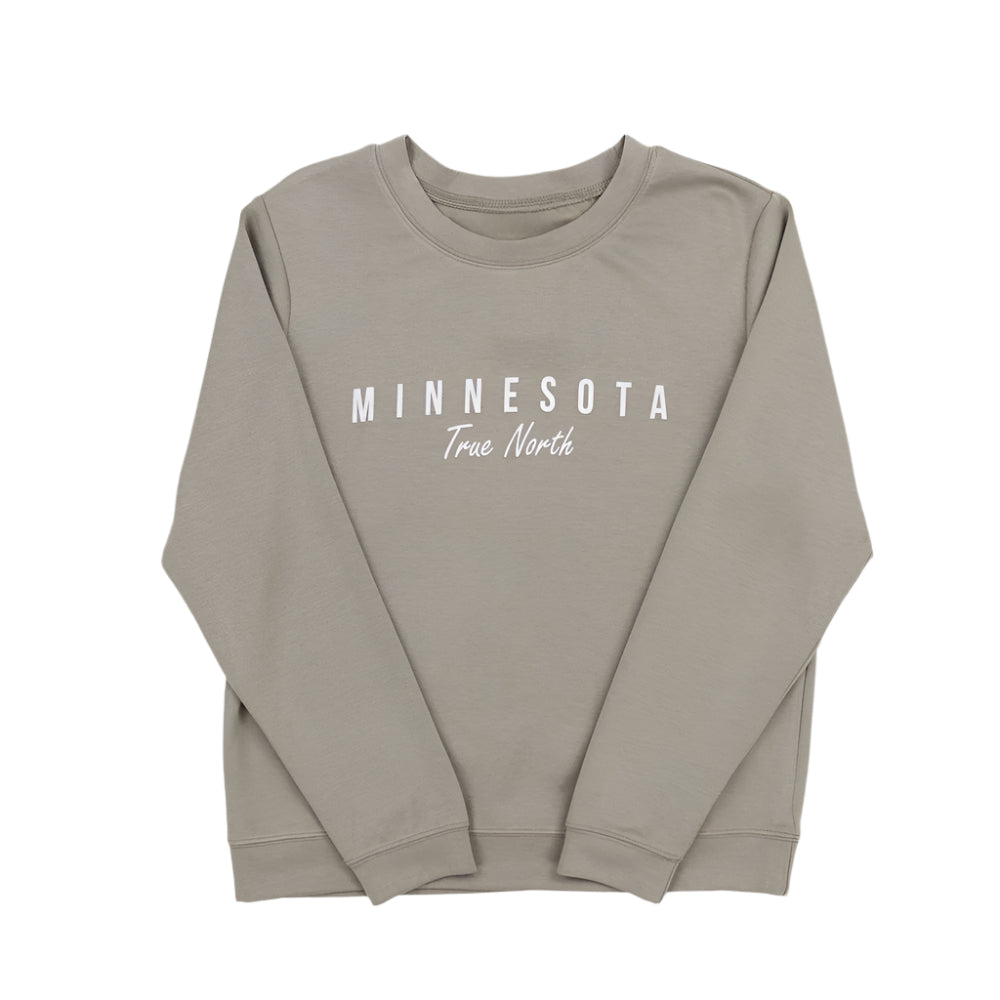 Celebrate your Minnesota pride with the True North Comfort Crew sweatshirt. Featuring bold "Minnesota" and "True North" text across the front, this cozy crewneck blends playful style with all-day comfort. Made from ultra-soft, breathable fabric with just the right stretch, it’s perfect for chilly days outdoors or relaxing at home. The relaxed fit and durable stitching make it a versatile favorite, ready to keep you warm while showing off your love for the North Star State in timeless, casual style.