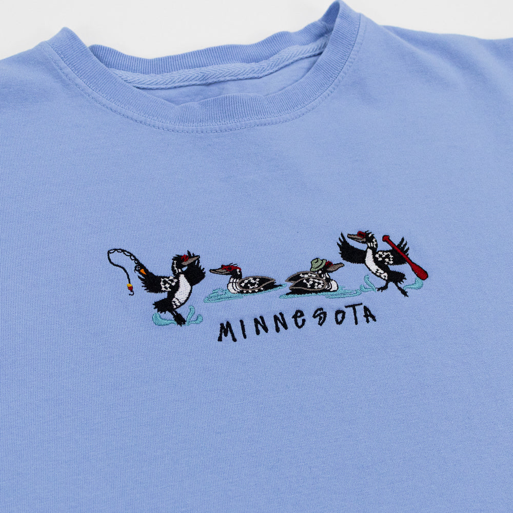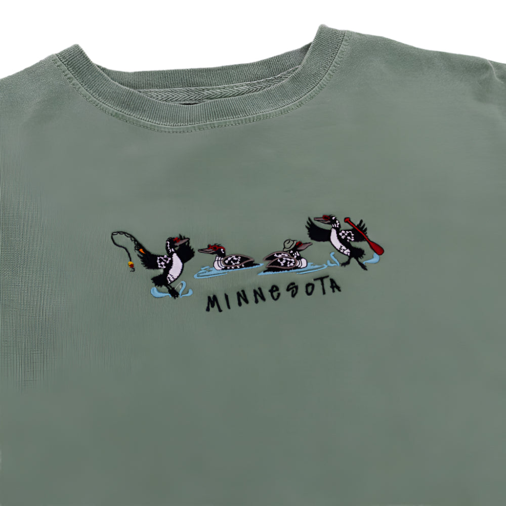 Bring a little northwoods charm and a whole lot of fun to your wardrobe with the Be'Boppin Loon Minnesota Tee Shirt. Featuring playful loons enjoying a day on the lake, this tee-shirt blends quirky Minnesota pride with a vintage inspired flair.