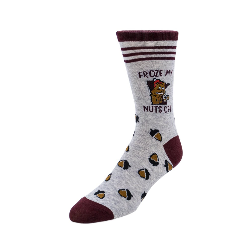 Pull on the Froze My Nuts Off Socks and embrace Minnesota winter with humor and style. These grey and maroon socks feature one of Love From's most beloved designs — a hilariously shivering squirrel clutching his last precious acorn for dear life. The cheeky text says it all: "Froze My Nuts Off." It's playful, slightly naughty, and absolutely, unapologetically Minnesotan. Perfect for anyone who's survived a brutal winter and lived to laugh about it. Because sometimes the best way to handle sub-zero temperatures is with a grin and a pair of socks that get the joke.