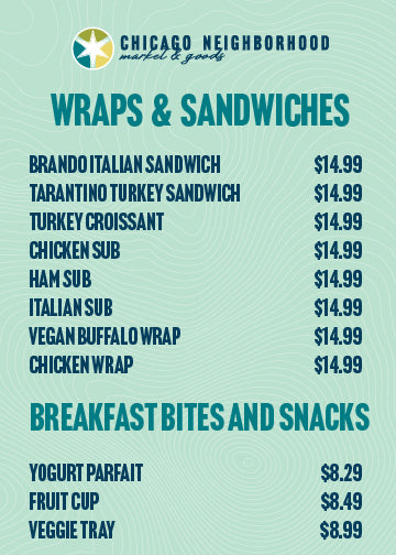 Located in Chicago's O'hare International Airport Terminal 5, Chicago Neighborhood Market & Goods sources fresh and tasty sandwiches, wraps, salads, and quick bites, from local Chicago vendors. Our mission is to buy local, because we love local, and to give back to the communities we serve.